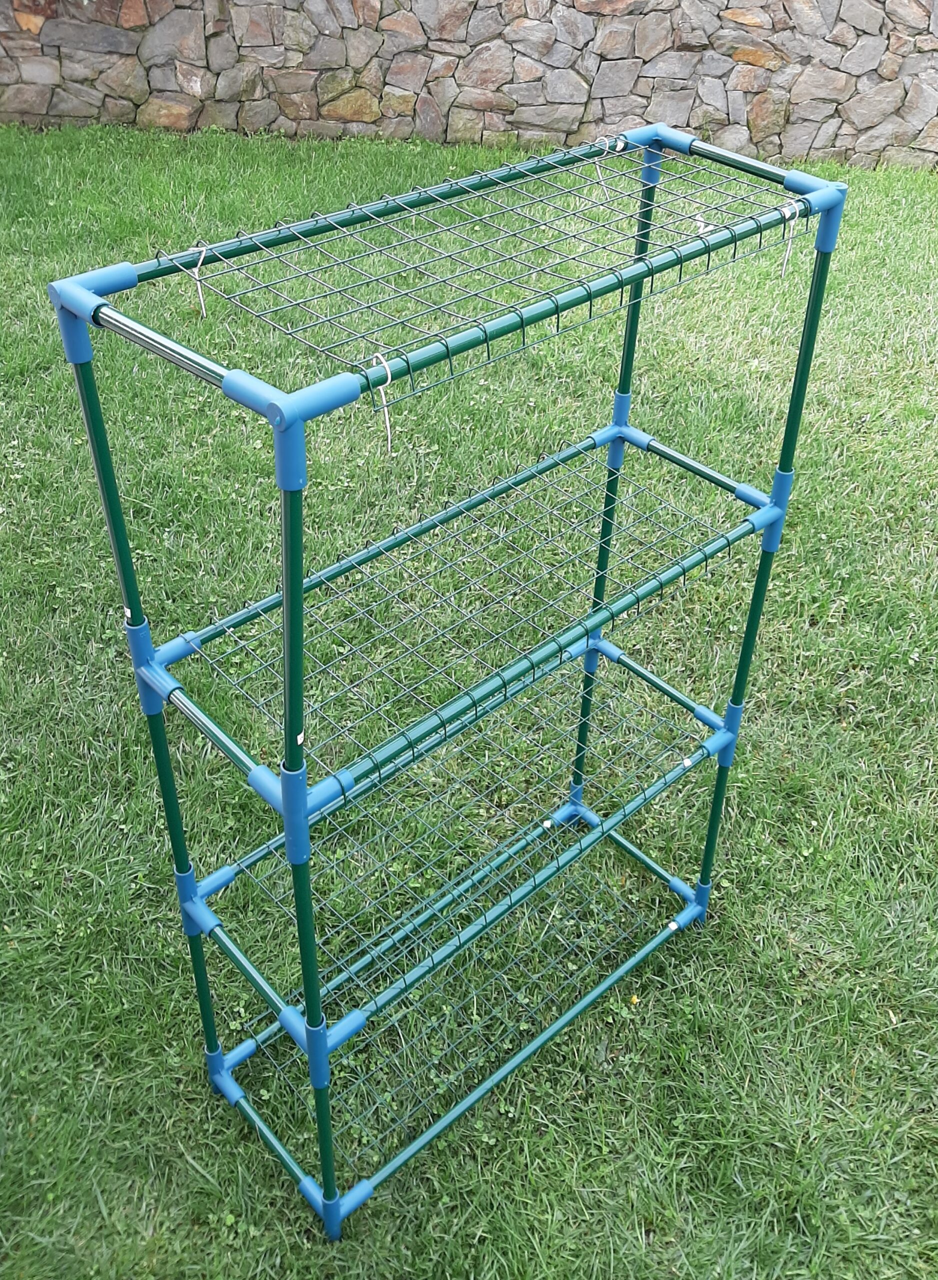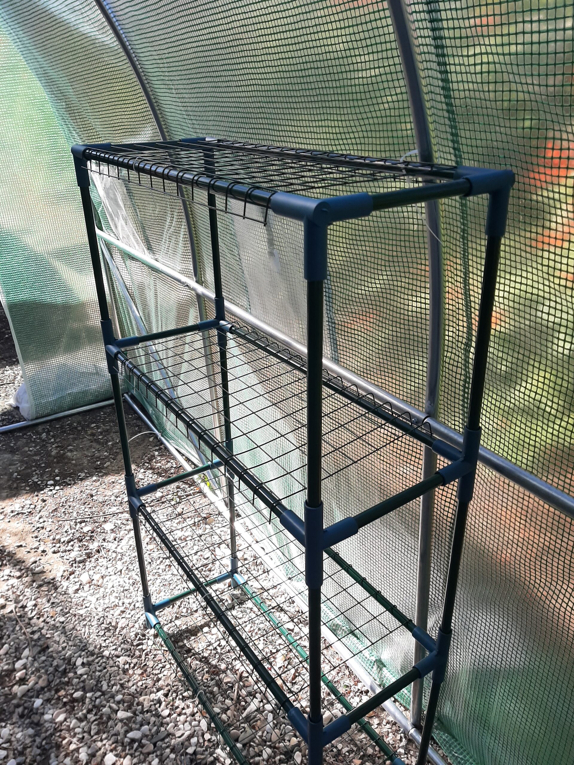 Estante ideal para utilizar em estufa. Prateleiras em rede metálica possibilitam rega das plantas e tabuleiros.